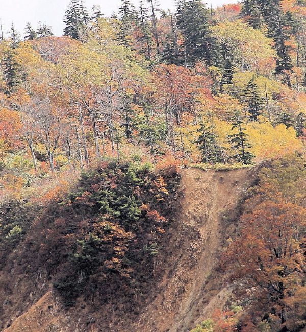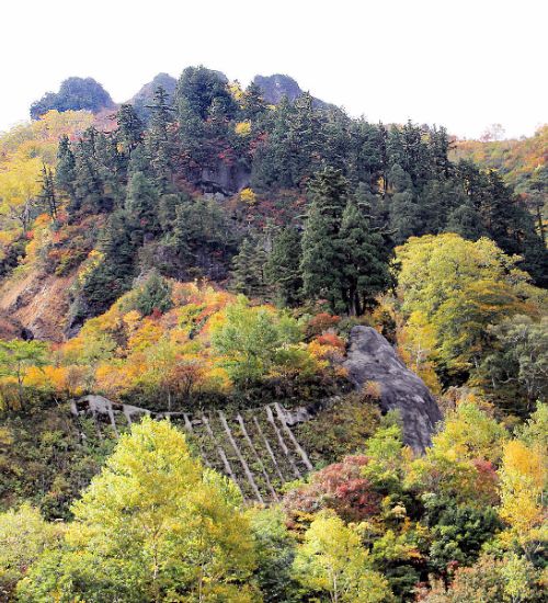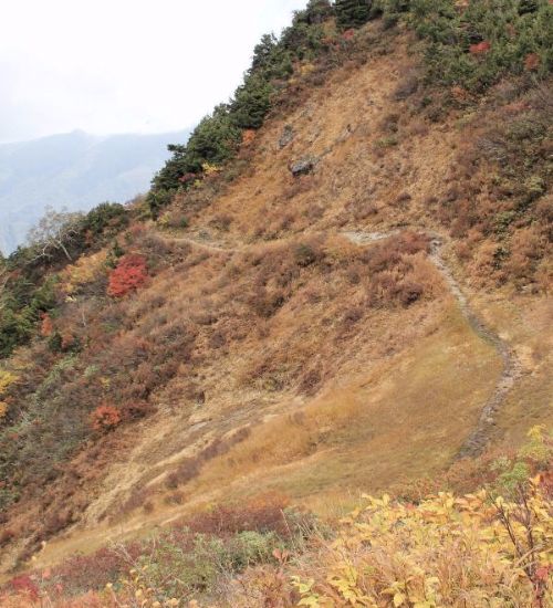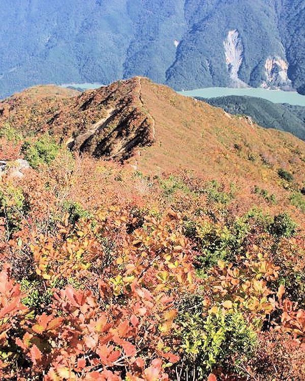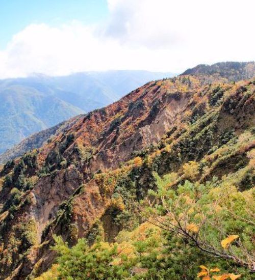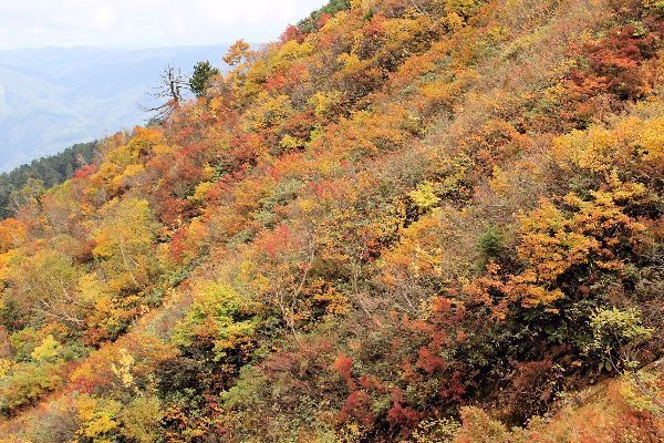 P1586まら鞍部を通り三方岩岳の直下に取り付く。右山腹を巻いて登り上がる。野谷庄司山への稜線は一面が紅葉に染まっている。