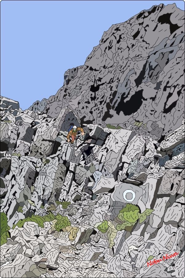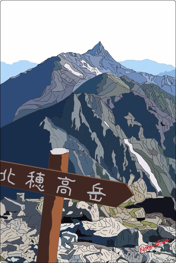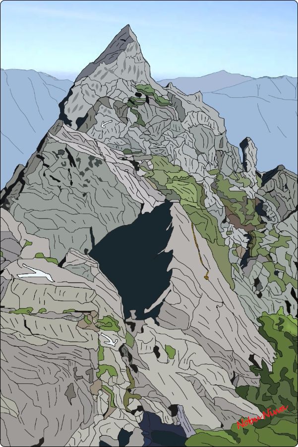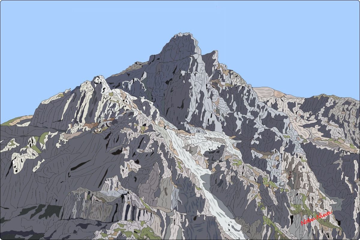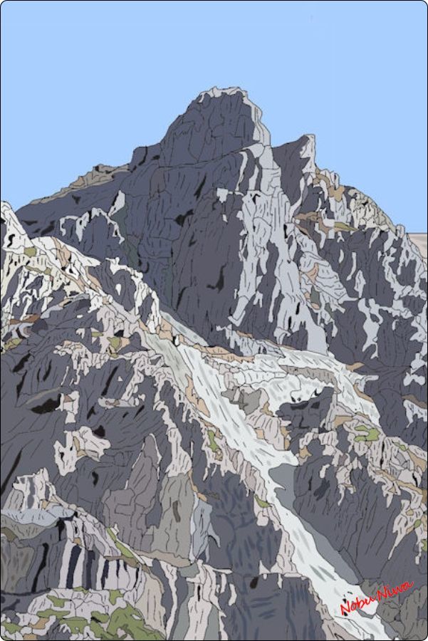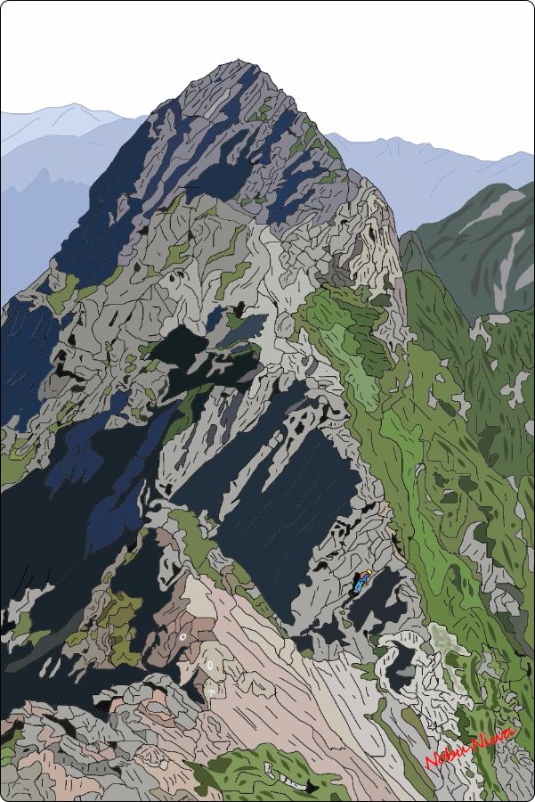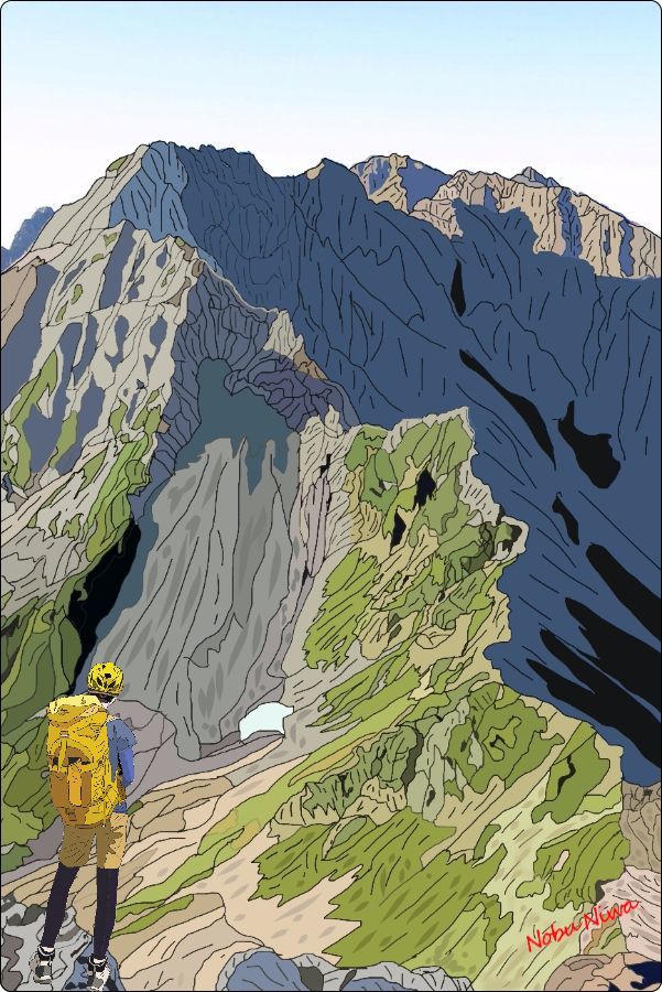 槍ヶ岳と穂高を結ぶ稜線上の大きく切れ下りた大キレット。場所によっては「窓」と呼ばれる地形で北ア屈指の難所。困難な縦走路で、そんな大キレットの魅力をスケッチしてみました。