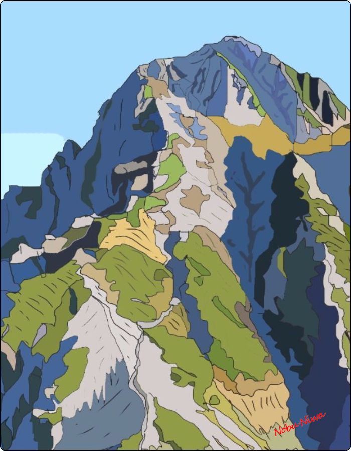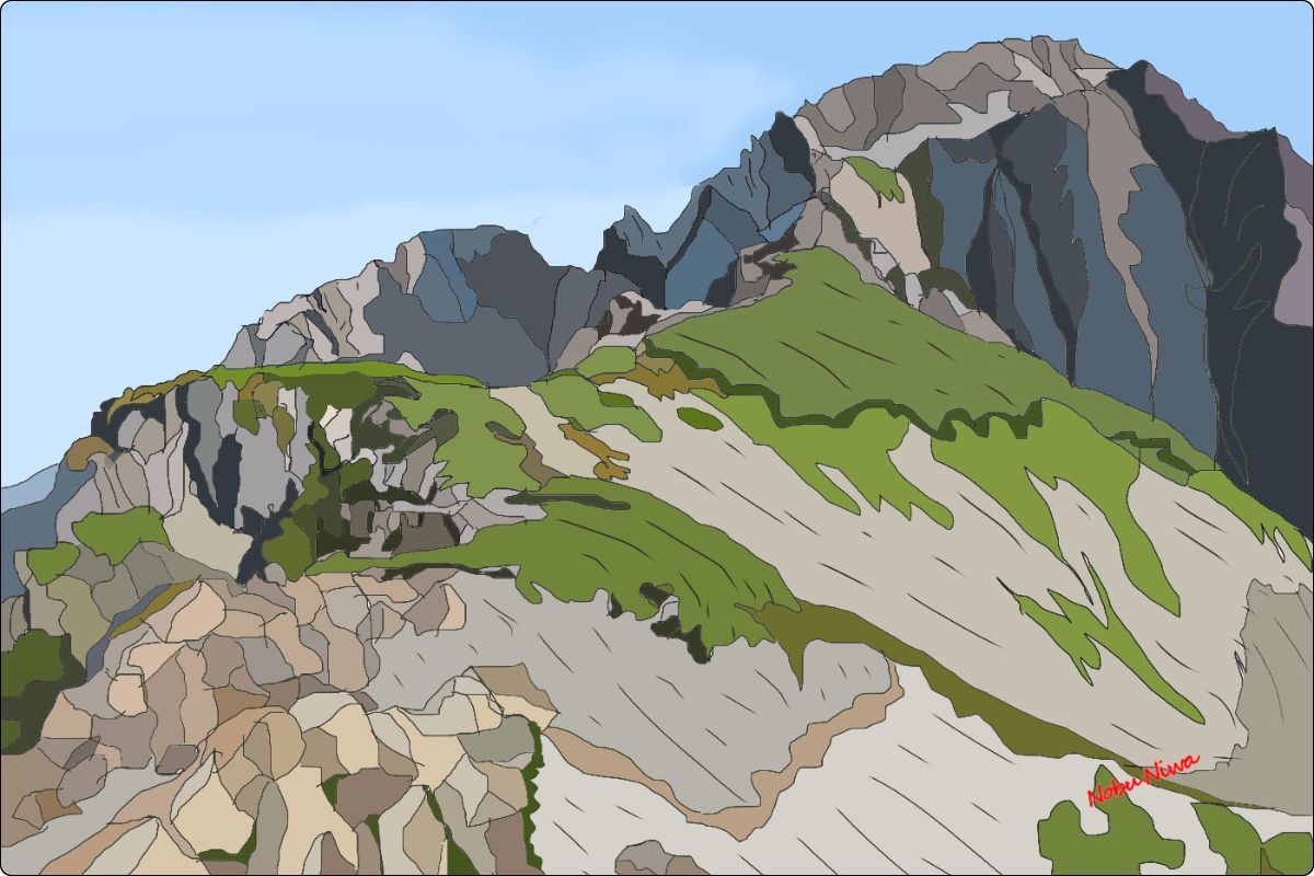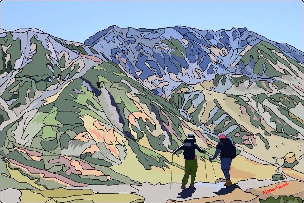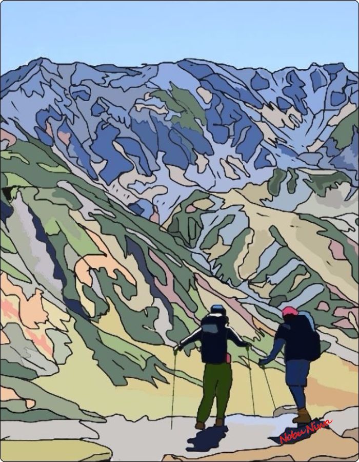 室堂ターミナルから地獄谷を通ってテント場のある雷鳥平にでる。浄土沢を渡ってその先で、急登の雷鳥沢を避けて新室堂乗越へ向かう。新室堂乗越から立山が一望できる展望はスケッチしたくなる光景。