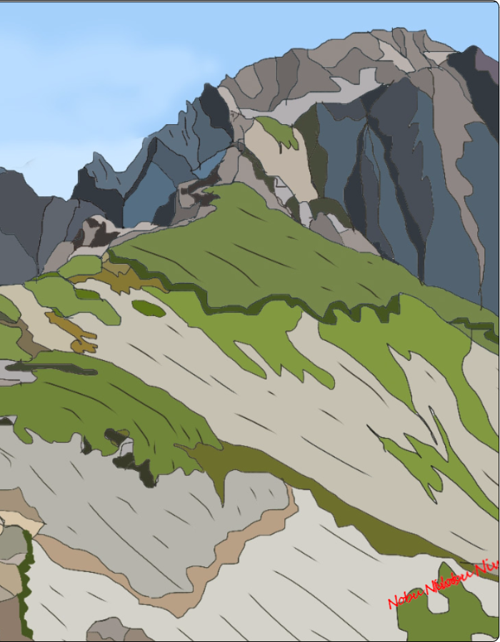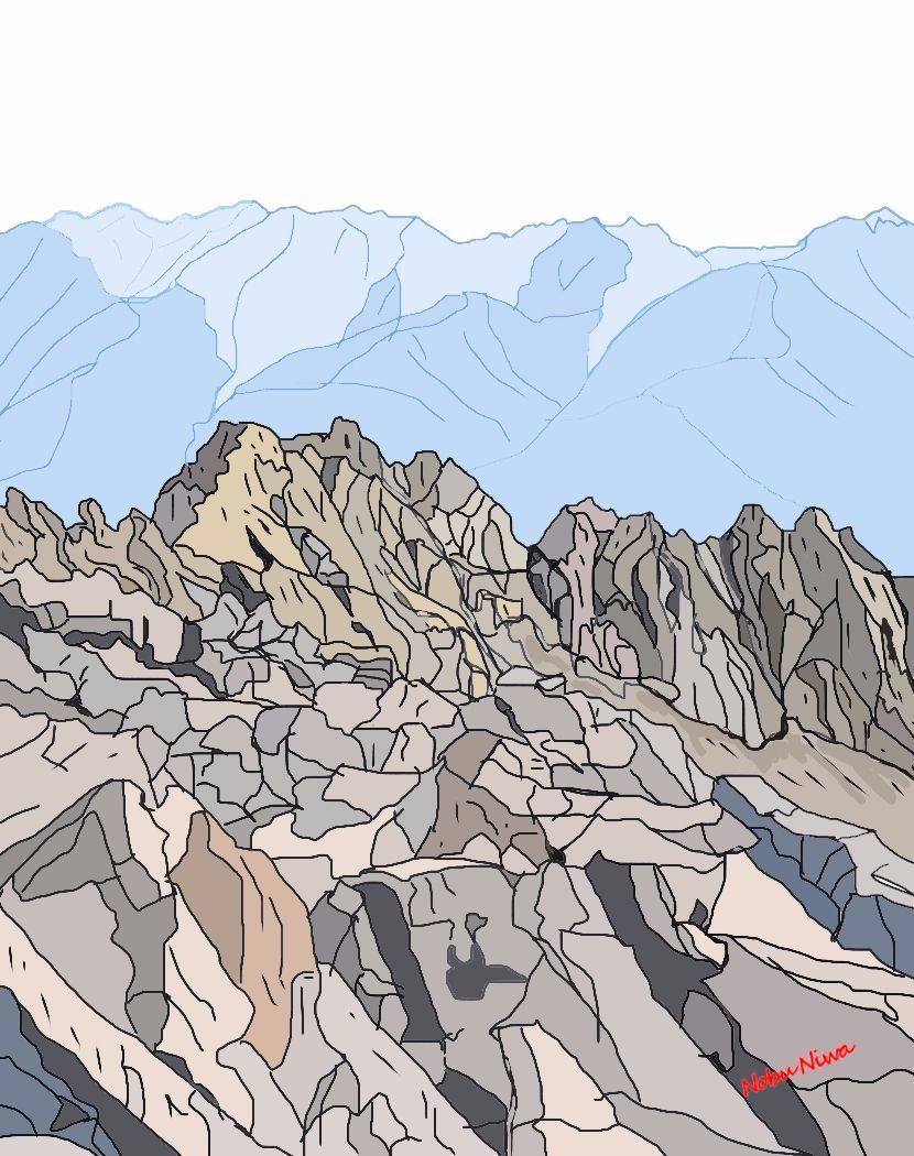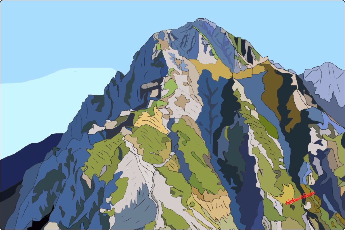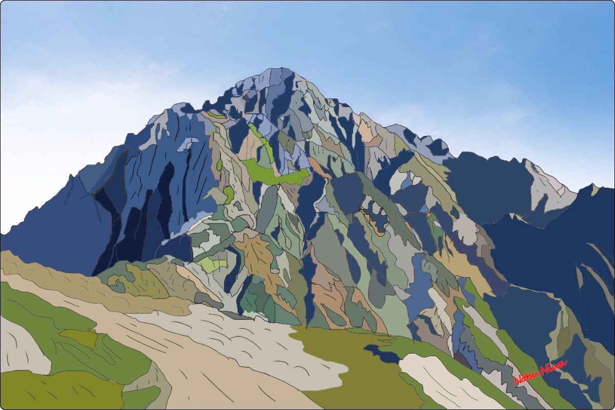 室堂ターミナルから地獄谷を通ってテント場のある雷鳥平にでる。浄土沢を渡ってその先で、急登の雷鳥沢を避けて新室堂乗越へ向かう。新室堂乗越から立山が一望できる展望はスケッチしたくなる光景。