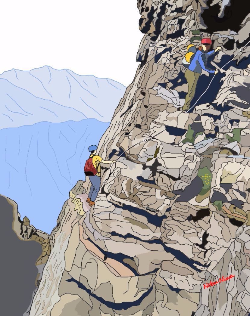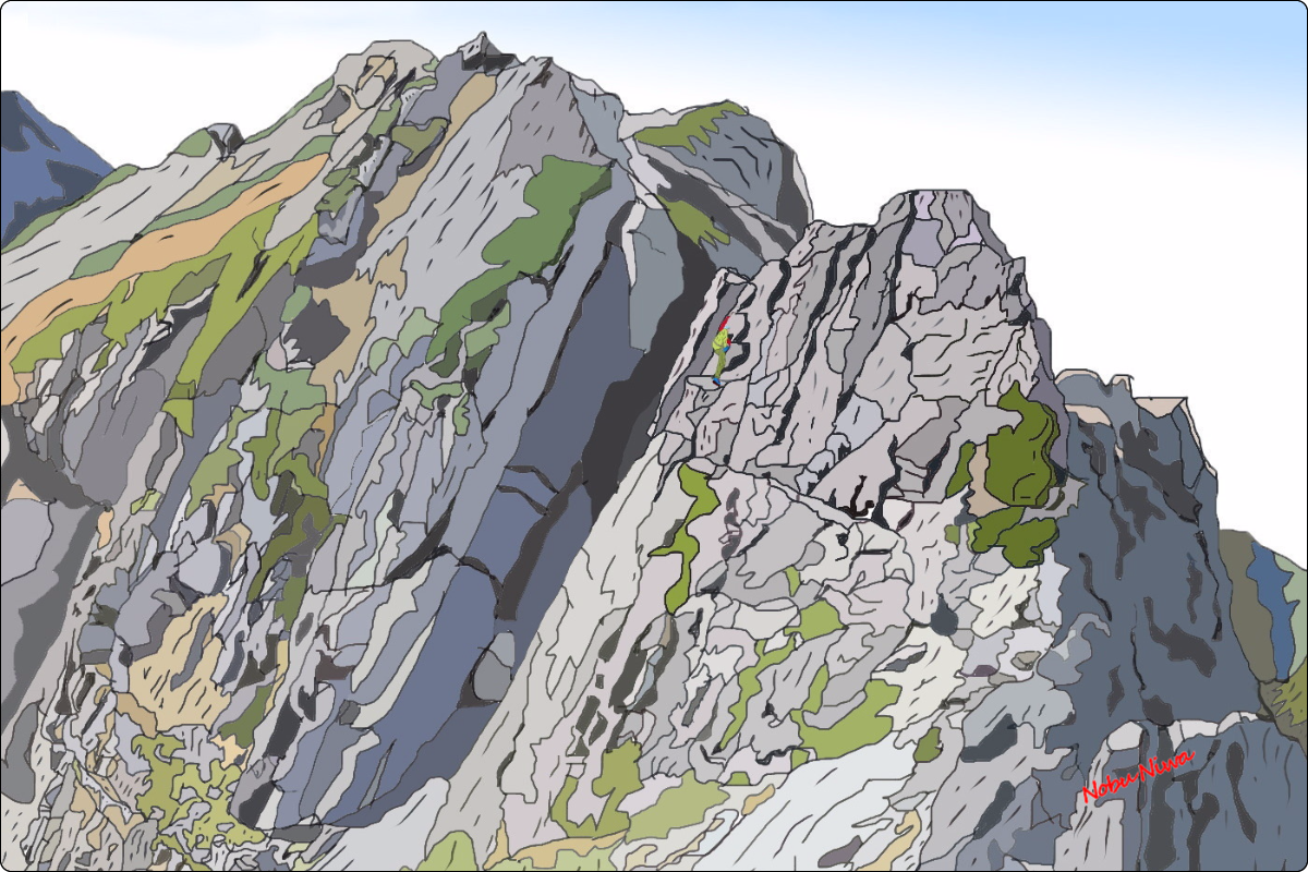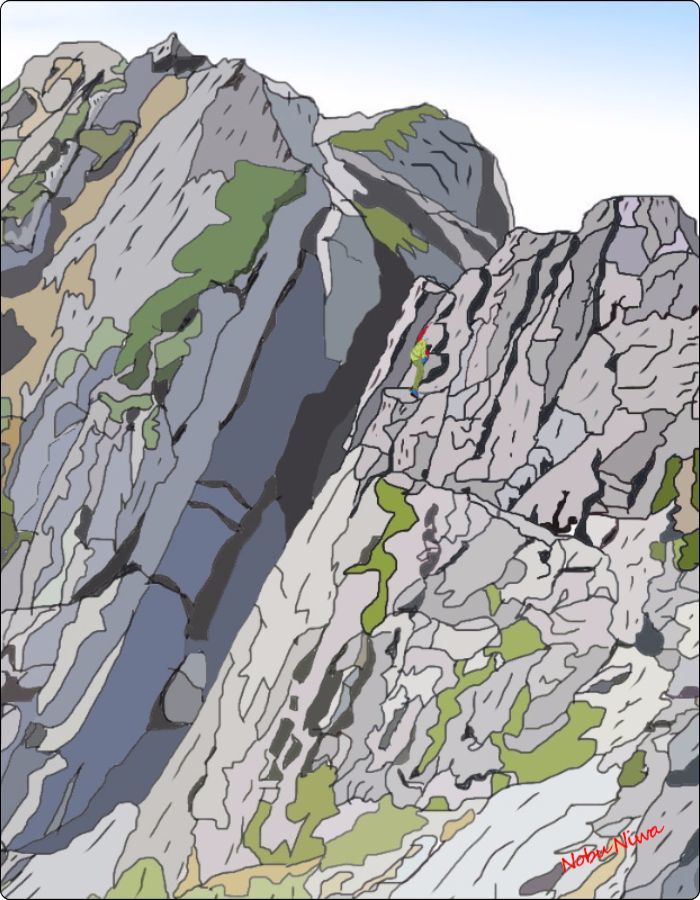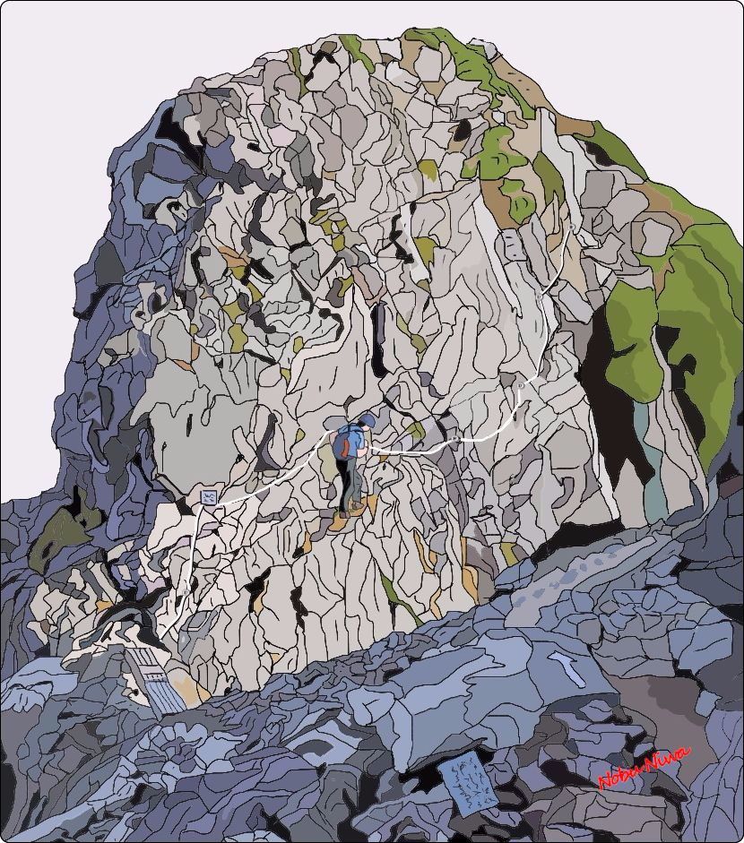 ここからはじまる急な岩場の登りが「カニのタテバイ」。平蔵のコルから平蔵谷上部を少し本峰南壁よりに横切った先が取付で、垂直に近い50mほどの岩場が立ちはだかる。高度感満点の巨大な岩場の壁。