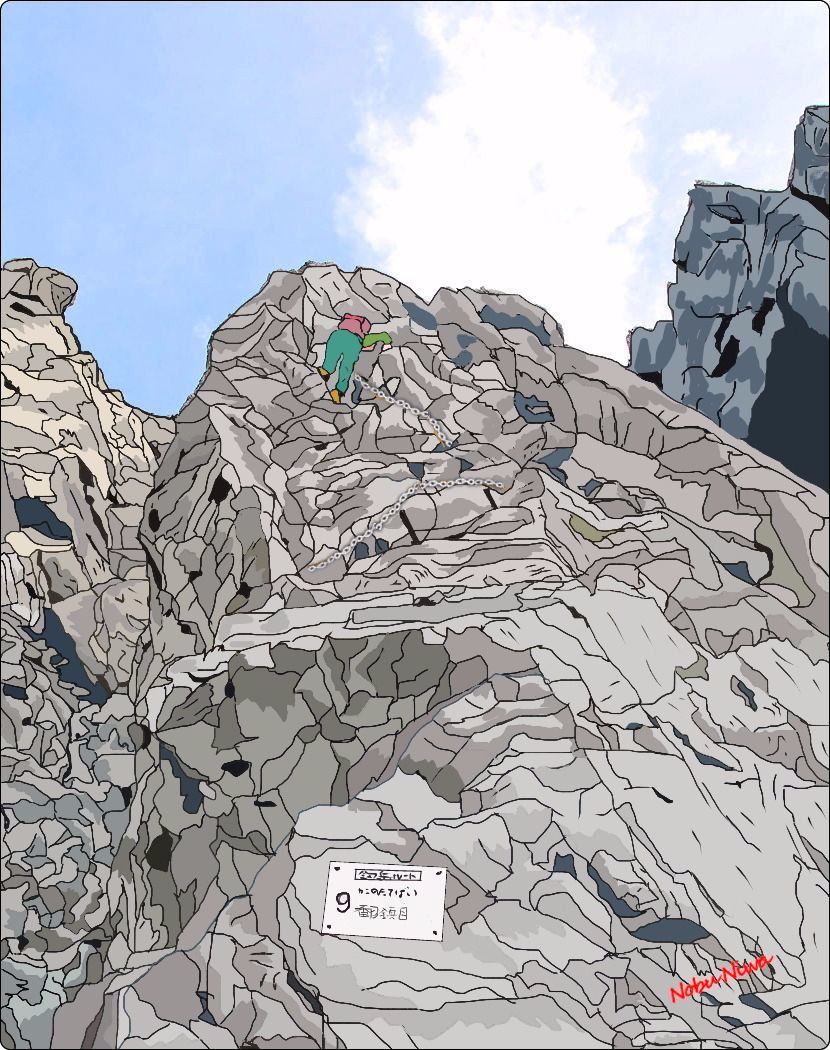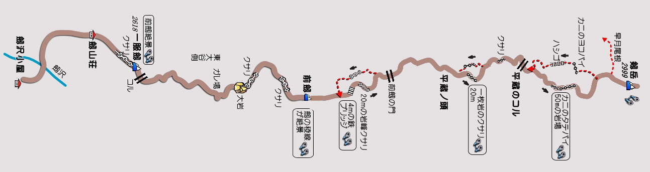 前剱から東大谷側へ稜を乗り越えて、足場の不安定な急な岩場を下る。次に現れる岩峰の手前で鉄ブリッジを渡り、この岩峰に取り付き、クサリに沿って右上していく。岩蜂の右肩からこれを巻く。