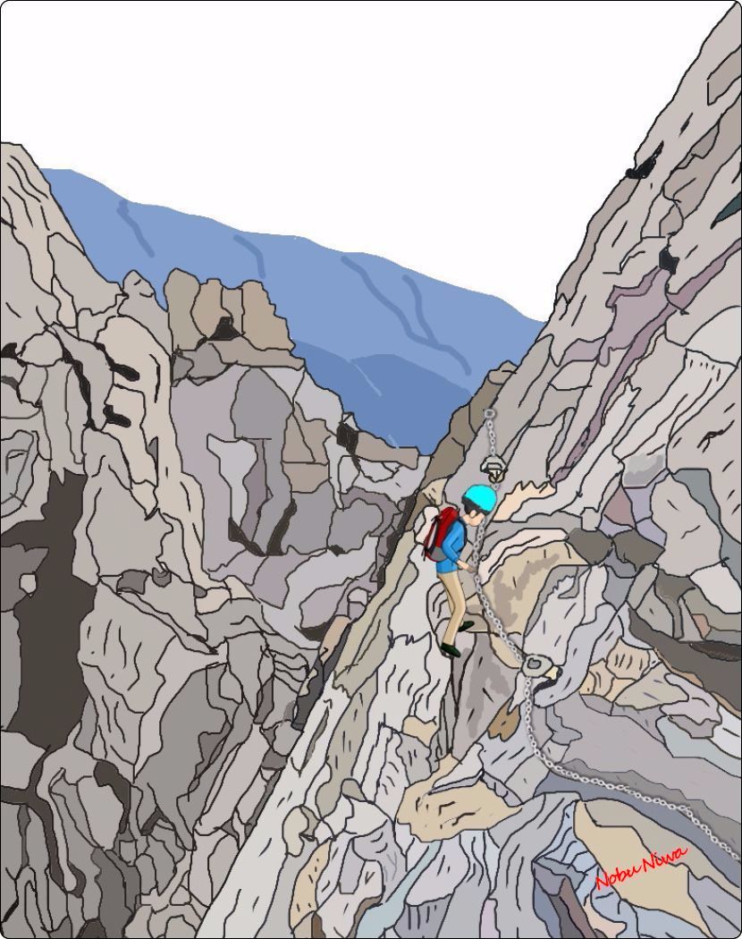 前剣から平蔵ノ頭は厳しい岩峰が続く。平蔵ノ頭を東大谷側へ巻いて通過し、岩峰にぶつかったところで、登下降路が分かれる。高度感抜群の一枚岩をクサリに沿って下る。振り返り岩峰を眺めると絵葉書にできる光家です。