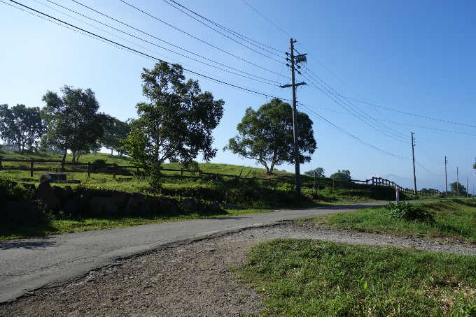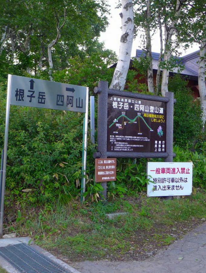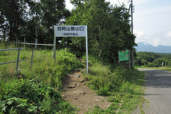 菅平牧場駐車場からまっすぐ登れば根子岳に達するが、この道は下山時にとることにし、右に曲がって牧場に沿って舗装道を400mほど進むと四阿山登山口の看板がありここを入る。