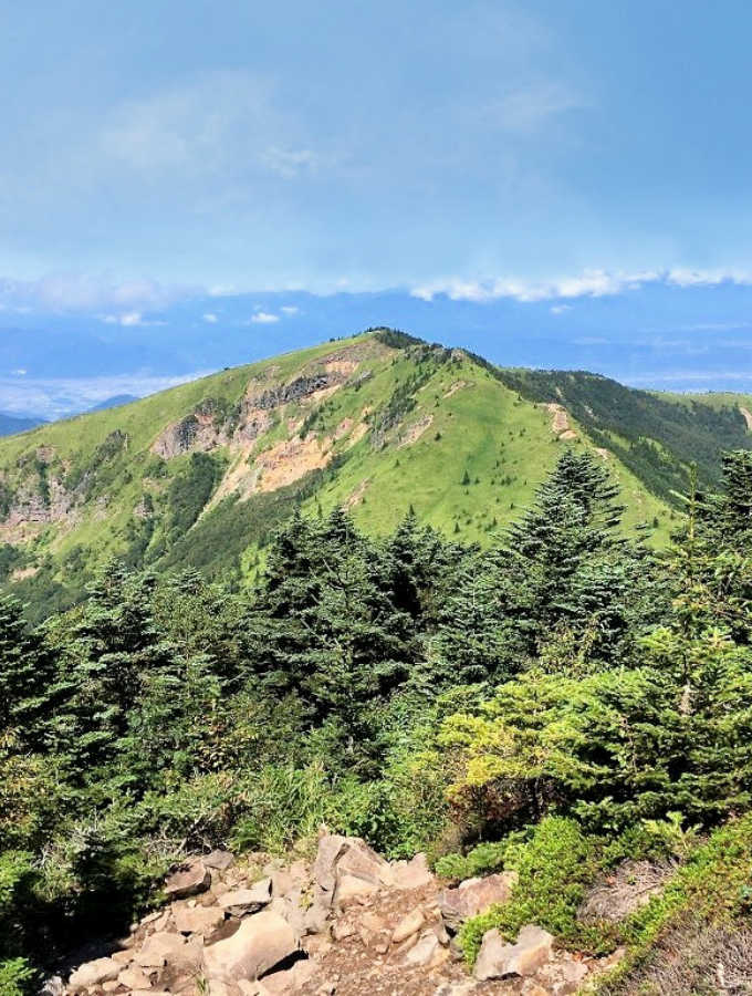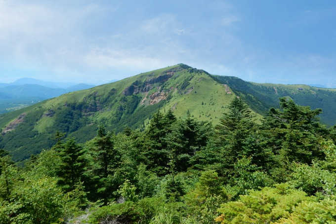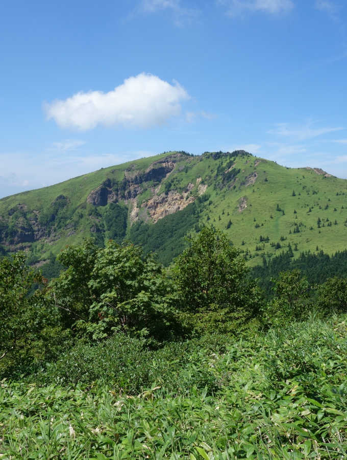 ゆるやかな斜面を登り始め、すぐに荒れ果てた林道を二度横切る。登るにつれ、根子岳が間近に見えるようになり、小四阿山に着く。振り返れば菅平高原が手にとるようです。