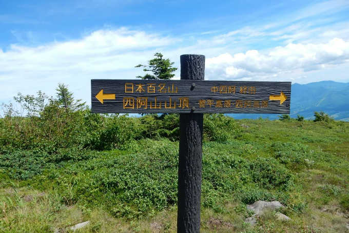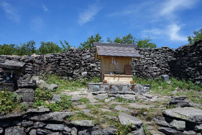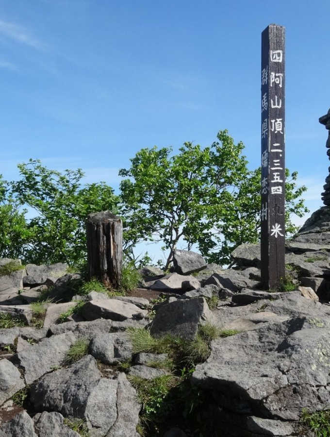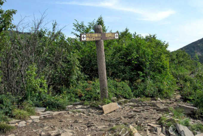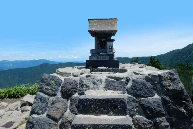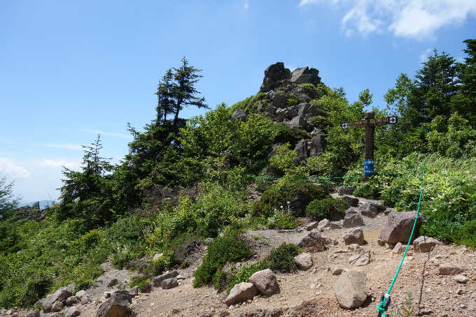 中四阿山から根子岳からの道を左から合わせると、もう四阿山の頂上は近い。木階段を登り上州祠を過ぎると、四阿山頂上に着く。