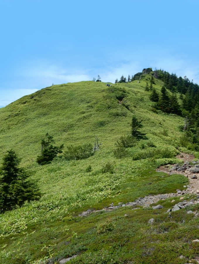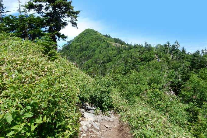 急坂を下りきった鞍部は笹原で、のどかな感じだ。登りに転じ、岩の重なる尾根を根子岳に向かう。
