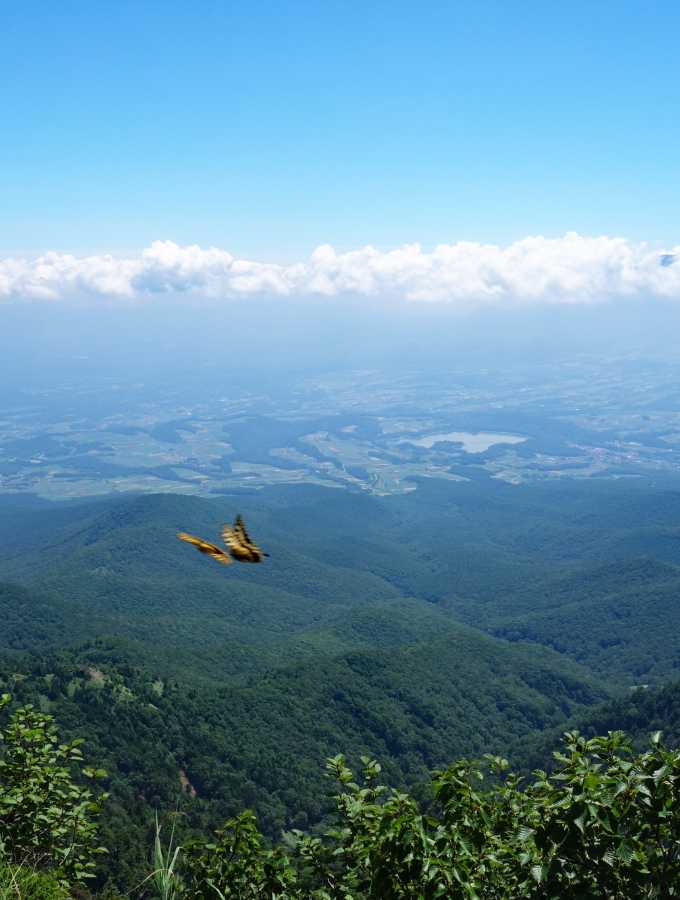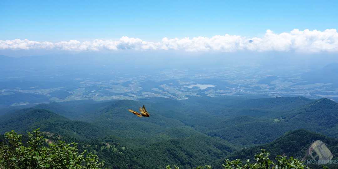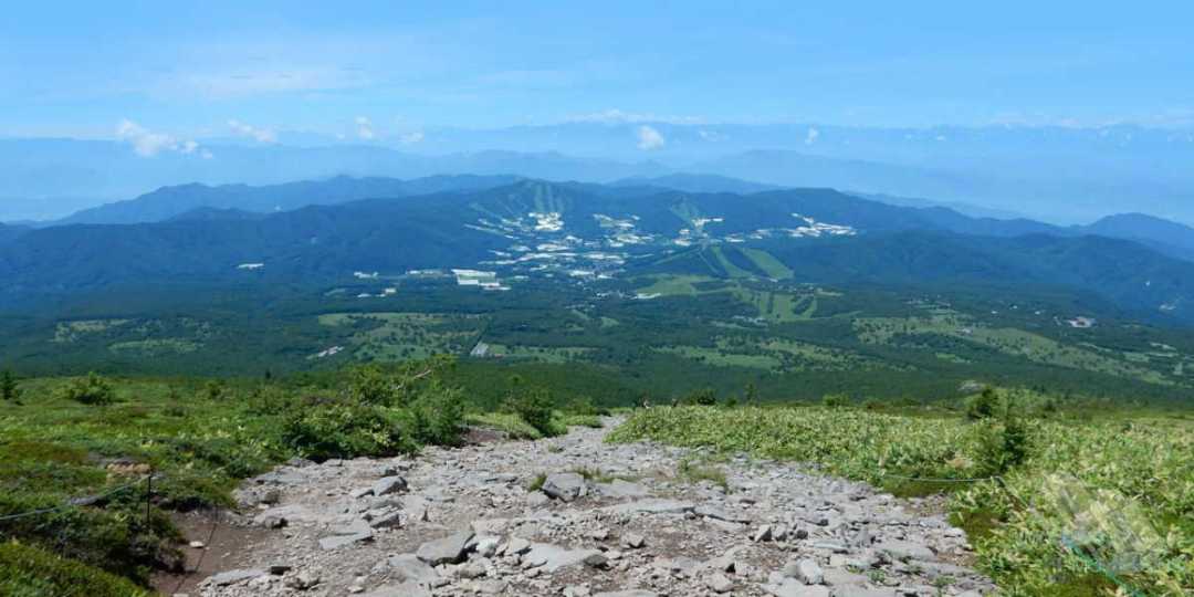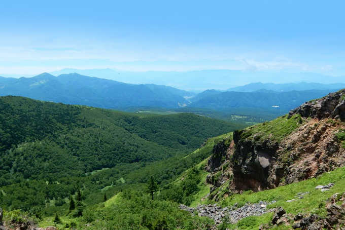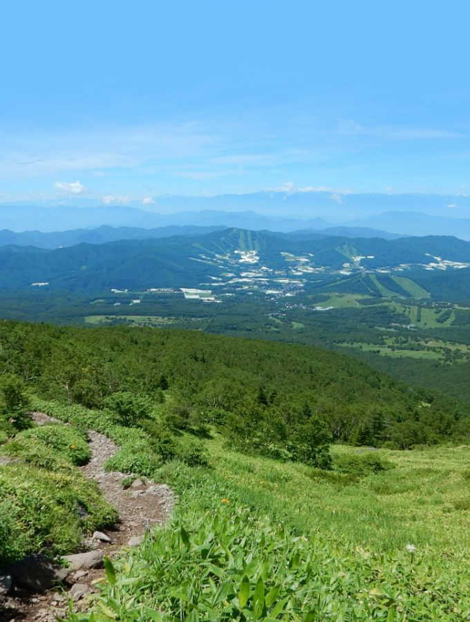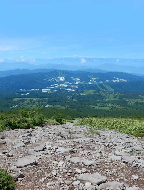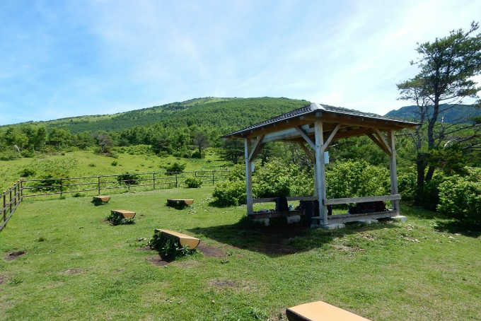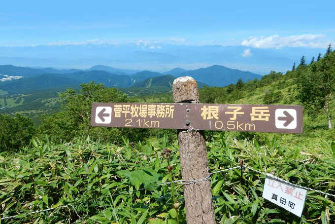 根子岳からは菅平牧場をめざし、ほぼ一本道を下る。眺望のよい道で、菅平高原を眼下に眺めて歩き、途中の展望東屋で休息をとり菅平牧場駐車場に下り立つ。