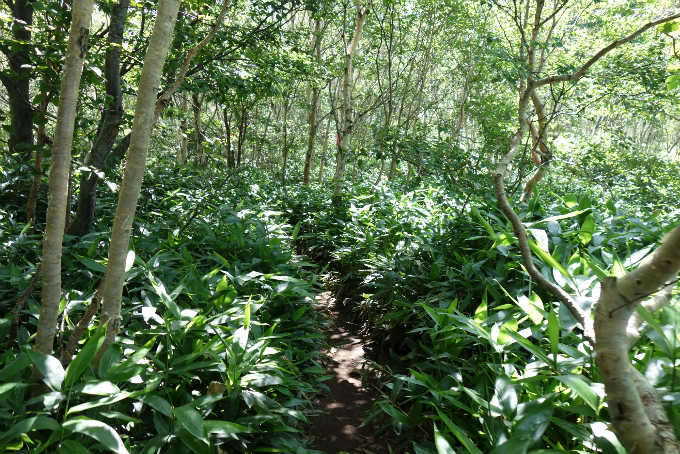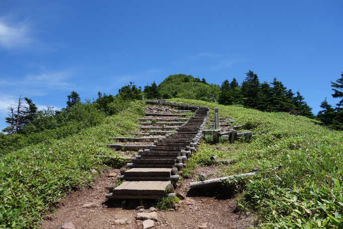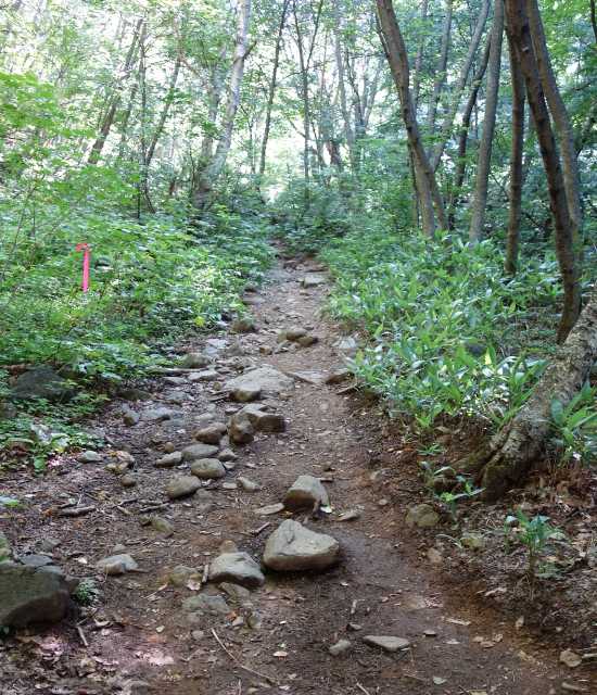 登ってきた道を少し戻り、右の根子岳への道に進む。急坂を下り鞍部に向かう。