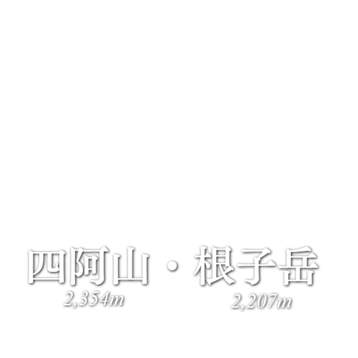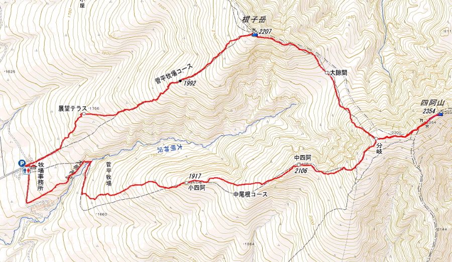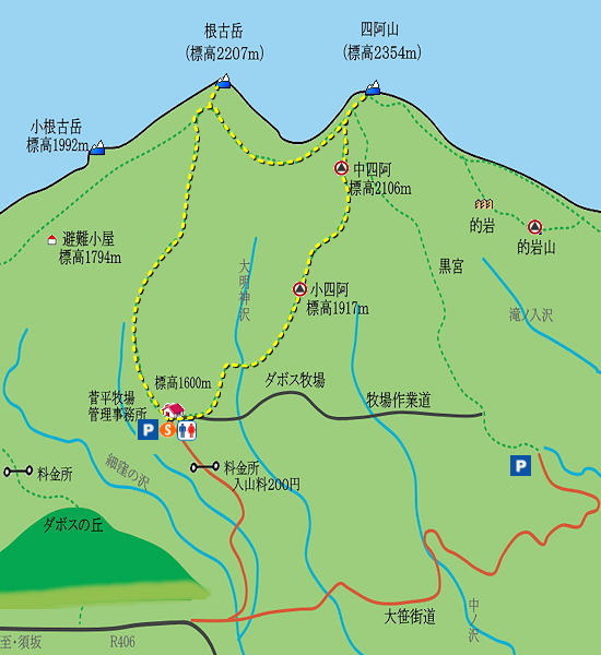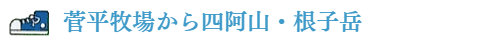 ・菅平牧場駐車場(20分)中尾根コース登山口(1時間10分)小四阿山1時間20分)根子岳分岐(10分)四阿山頂上(10分)根子岳分岐(25分)鞍部(40分)根子岳頂上(1時間30分)菅平牧場駐車場(40分)