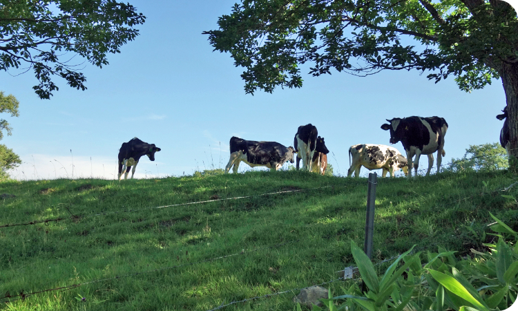 菅平高原に広がる草原、白樺林に囲まれた牧場で、ゆっくりと草をはむ牛たち。牧歌的なムードに包まれて、高原のすがすがしさ安らぐ風景です。
