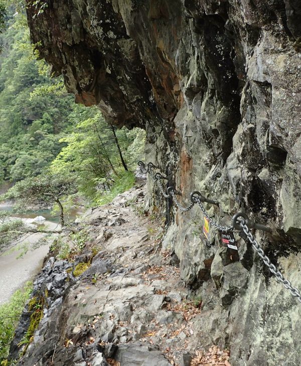 登山口は宮川第三発電所の裏手に入るとすぐ太い鎖付きの岩棚道となる。 大日嵓の中腹をコの字形にえぐってつくった道である。ところどころ岩の間から水が滴り落ちて濡れているので。要注意です。
