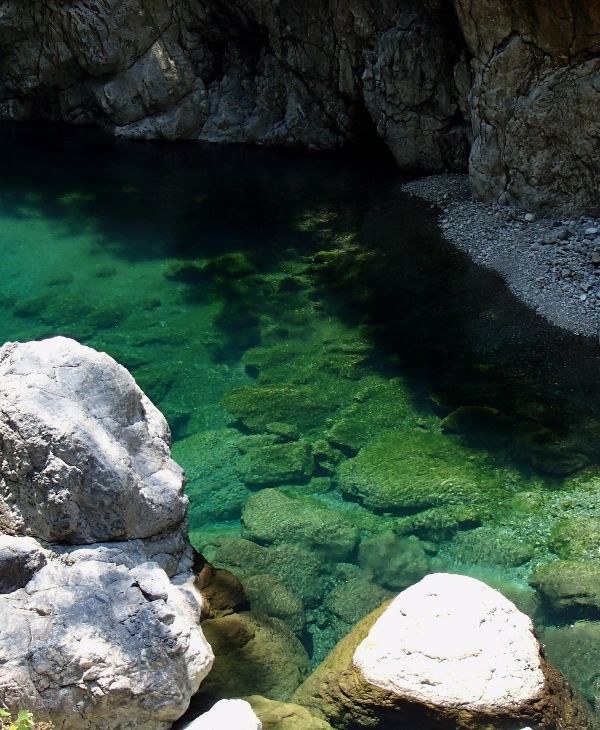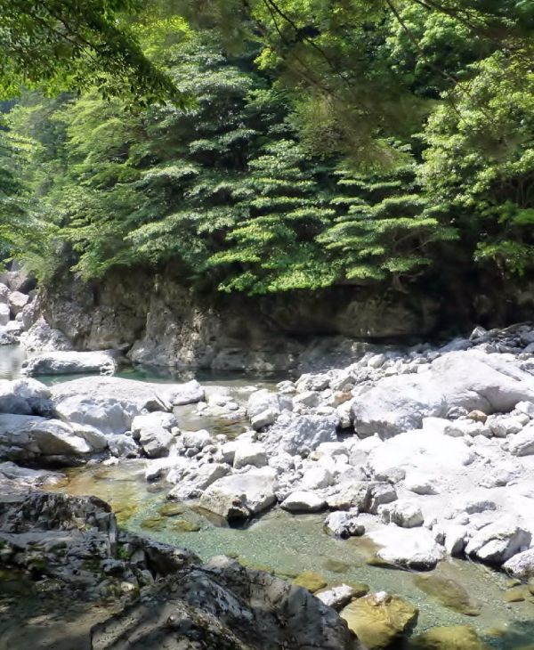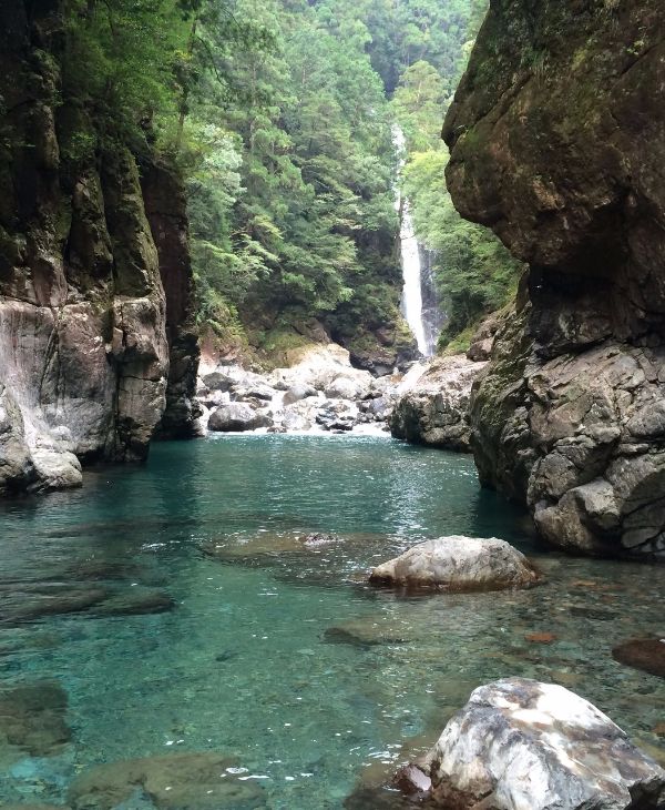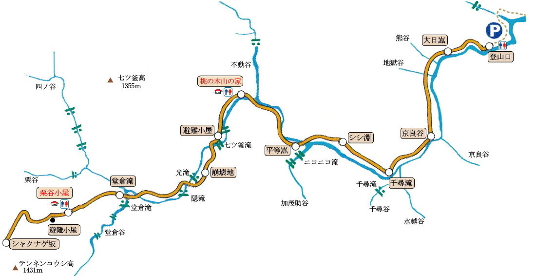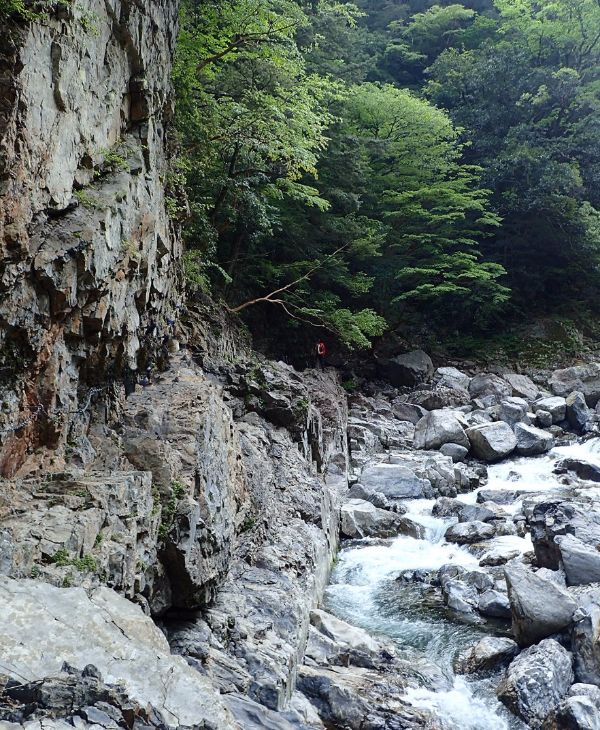大日嵓吊橋、能谷吊橋、地獄谷吊橋と渡るうち京良谷出合に着く。 出発して1時間あまりです。河原に出て休憩をとる。 水越谷出合をすぎると、ほどなく千尋滝前休憩所に着く。
