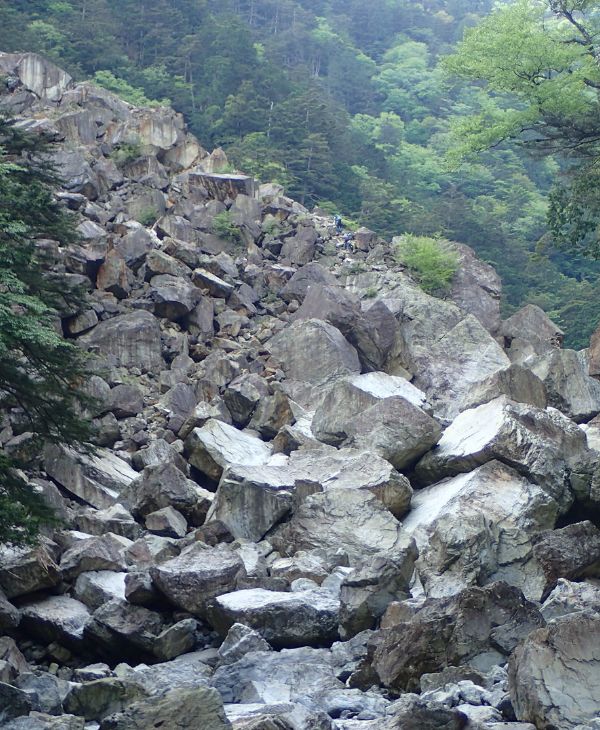 千尋滝からシシ淵間は崖崩れが起こりやすく、崩壊地を巻いていくので危険が大きい。足元に注意して進む。