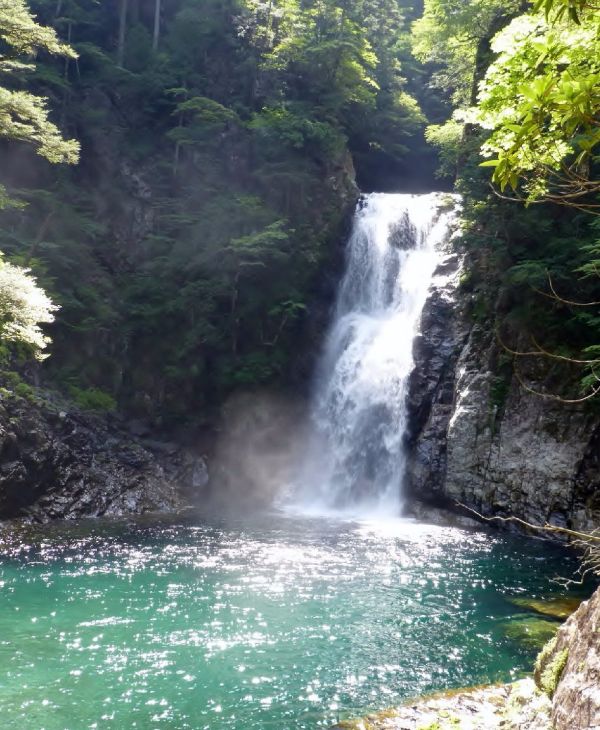 七ツ釜吊橋で右岸に渡ると少し平坦となり光滝、隠滝、堂倉滝と名瀑が続く、堂倉滝は低いながら堂々たる風格のある滝です。