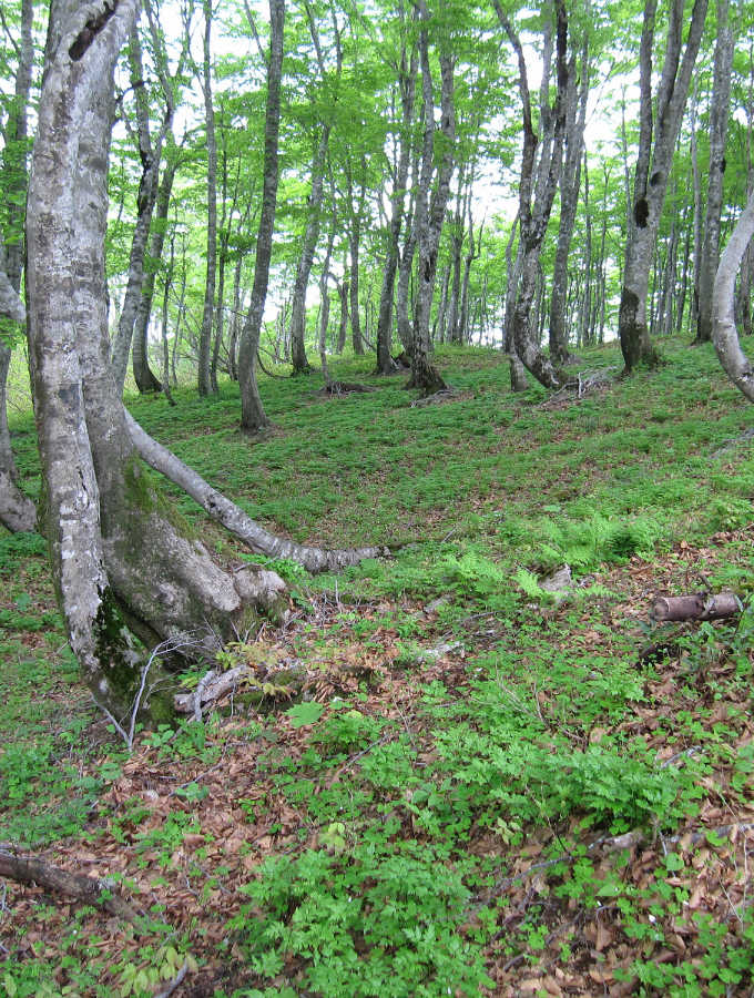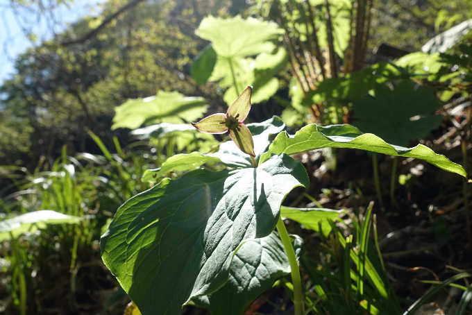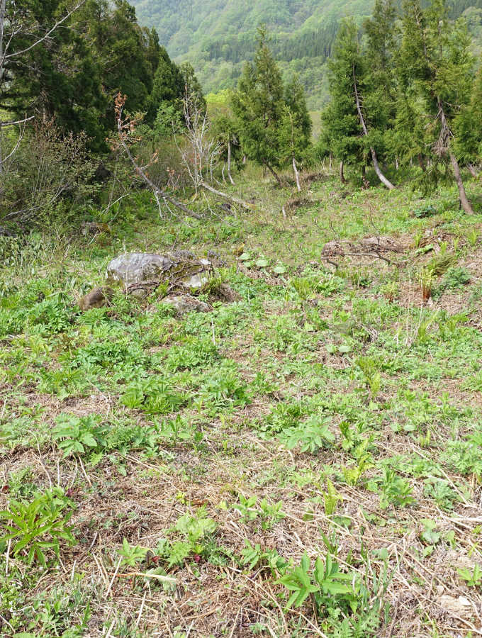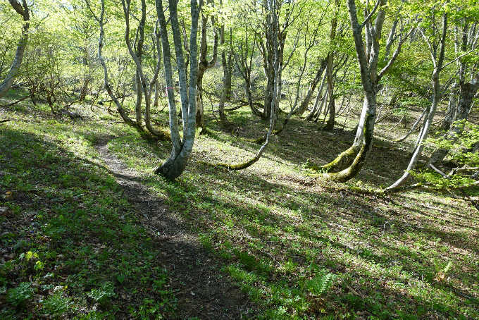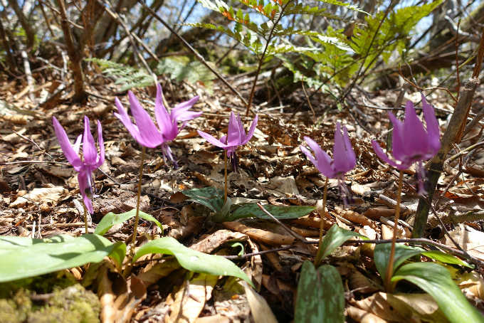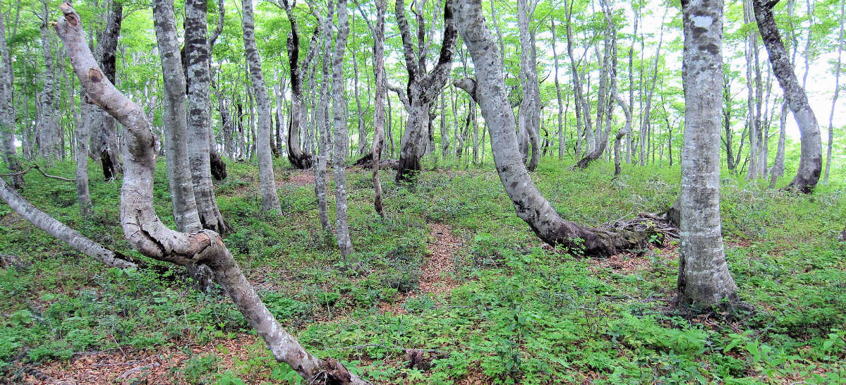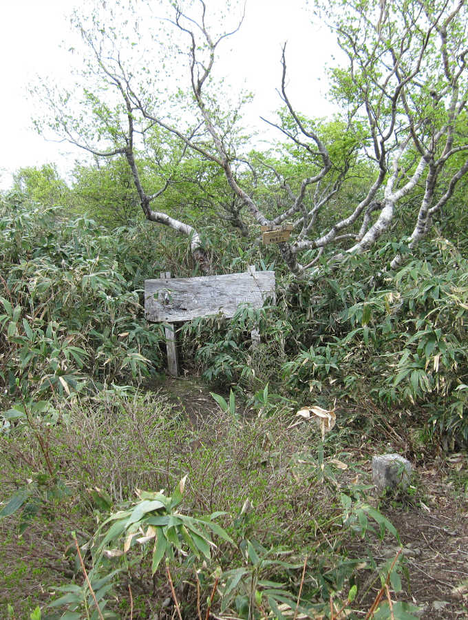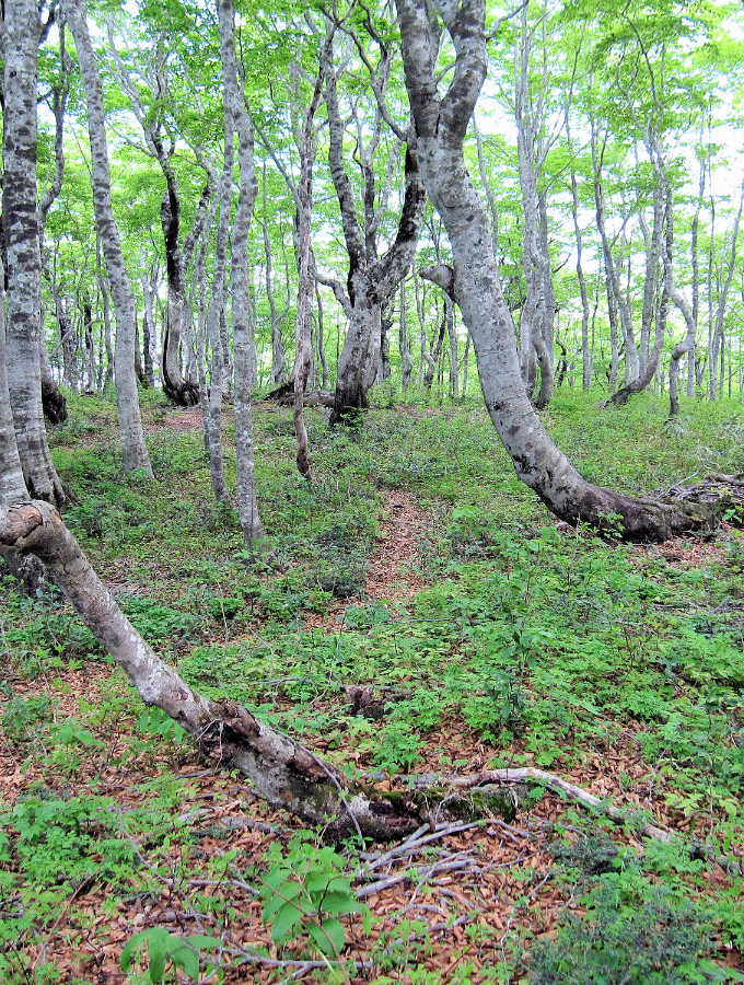 ミズバショウの群生地を過ぎて1447mまでは緩やかな登りだが、ササが切り開かれた道となる。道は南に向かうようになる。サンカヨウが群生して癒される。山頂直下にはカタクリの花がみられる。