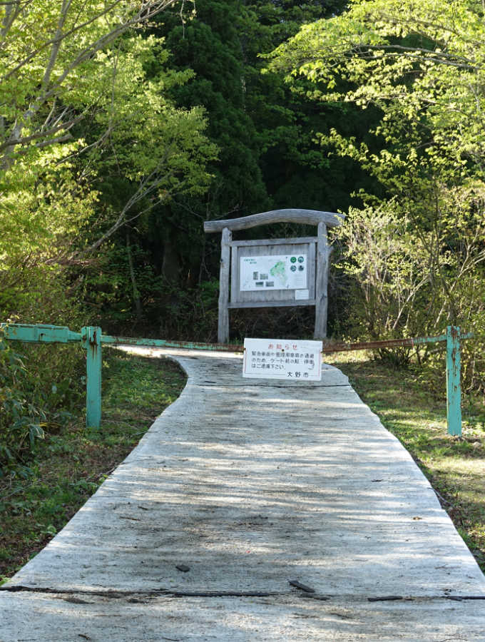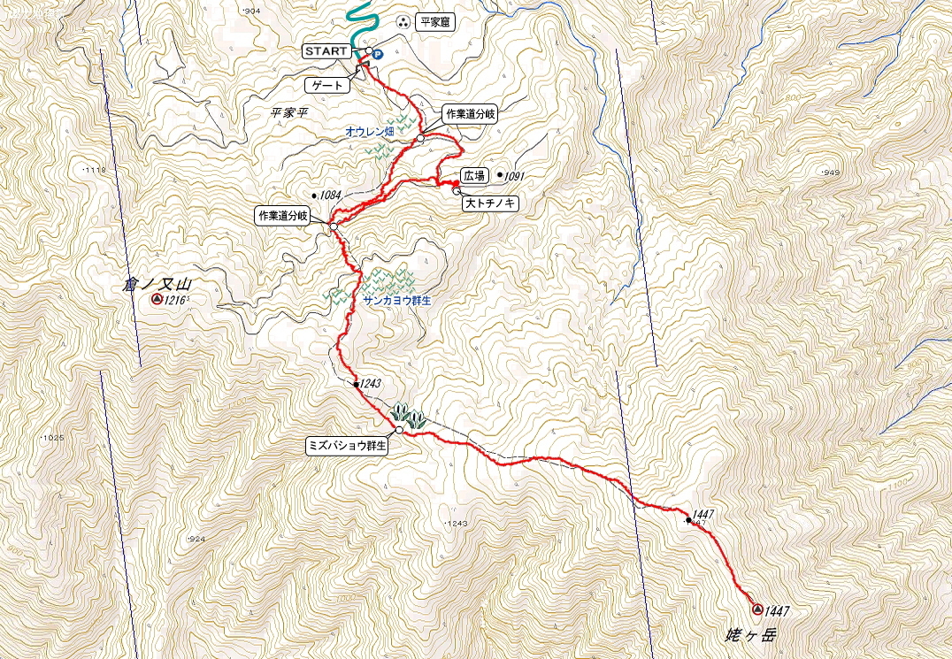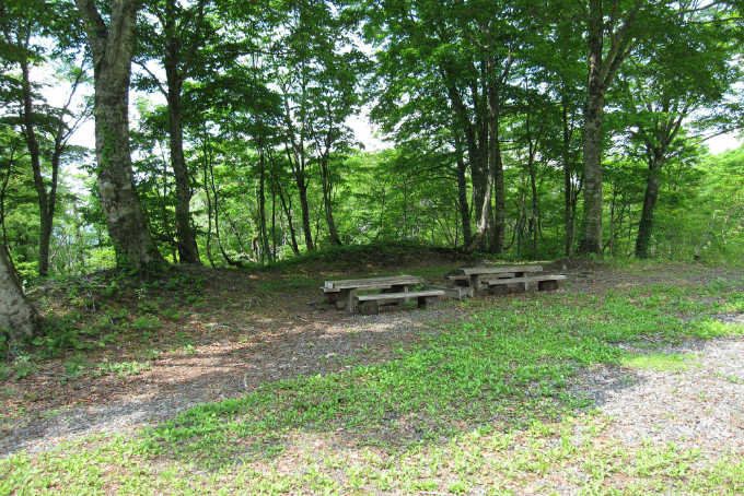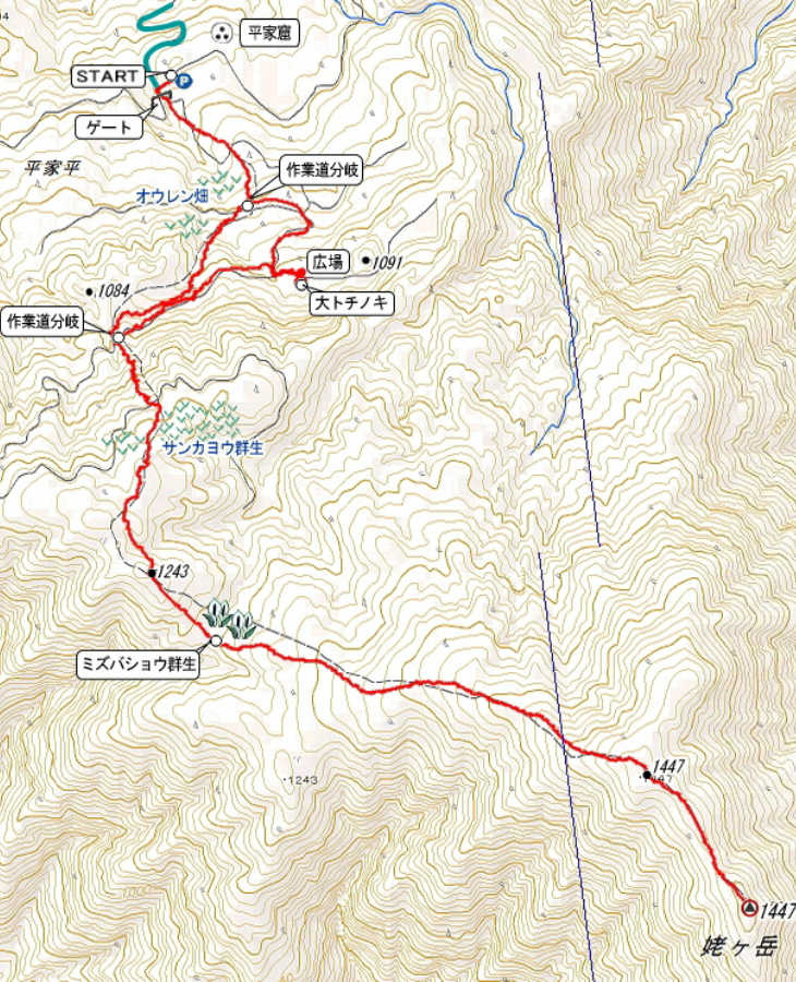駐車場(9:19)→登山口(9:21)→林道出合(4.3km)(9:26)→林道出合(3.3km)(9:58)→林道出合(2.9km)(10:11) →林道終点(2.7km)(10:20)→1243mピーク(10:24)→水芭蕉群生(10:36)→1447mピーク(11:25)→山頂(11:42/11:55)→水芭蕉群生(13:07)→1243mピーク(13:19)→林道終点(2.7km)(13:26)→林道出合(2.9km)(13:31)→林道出合(3.3km)(13:40)→大トチの木(13:55/14:32)→林道出合(4.3km)(14:47)→登山口(14:51)→駐車場(14:53)