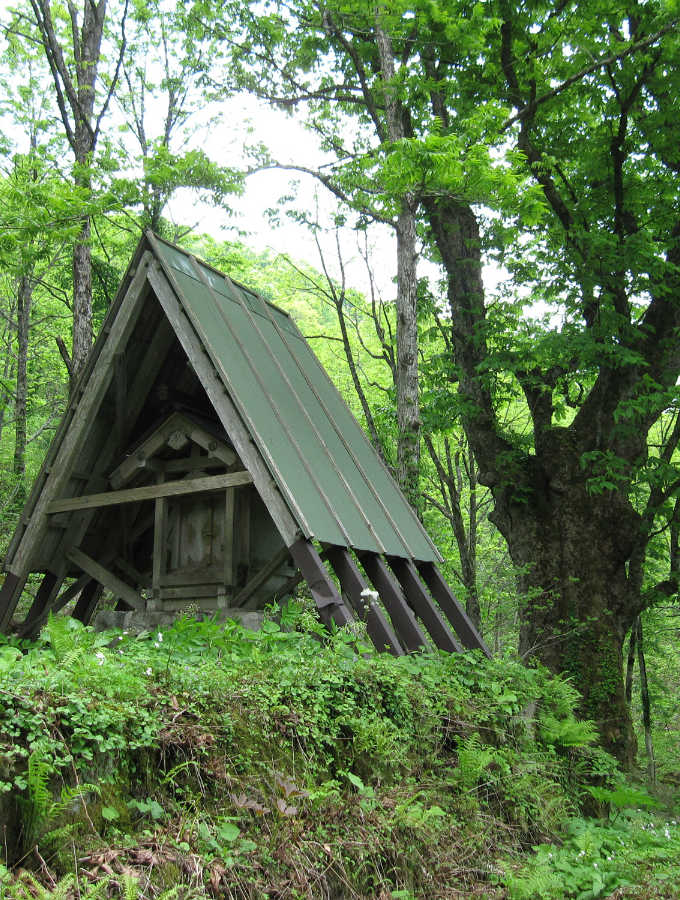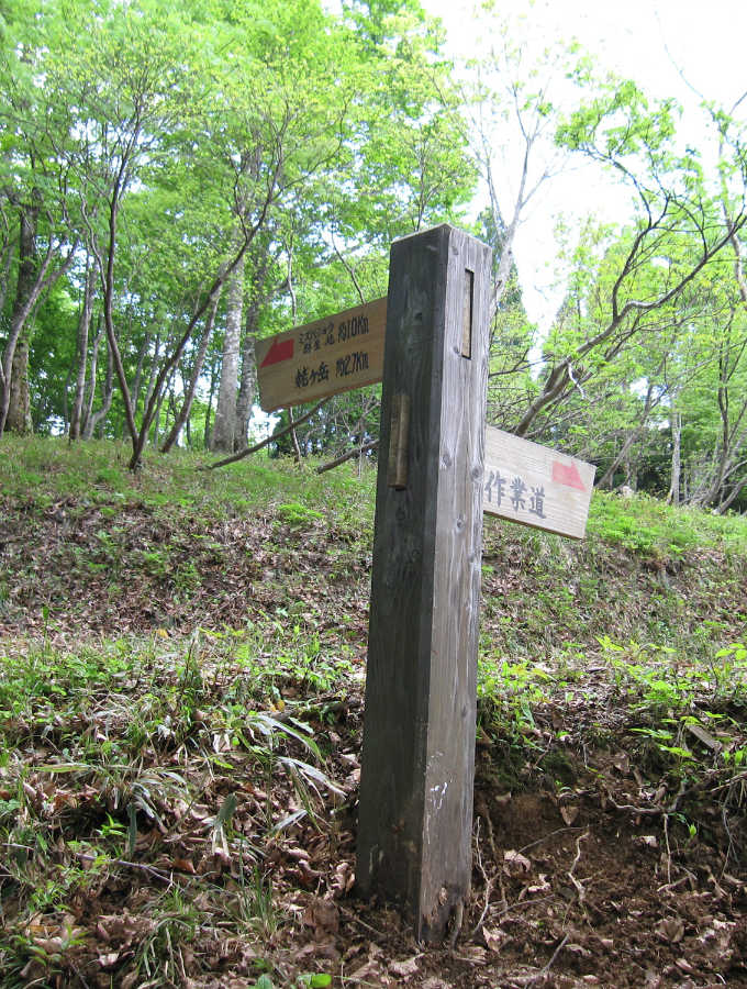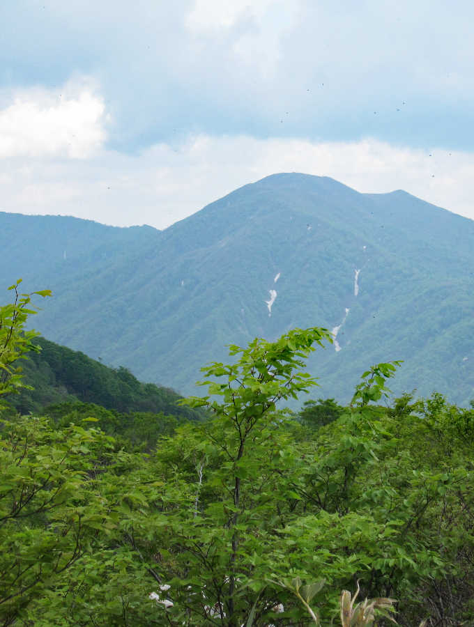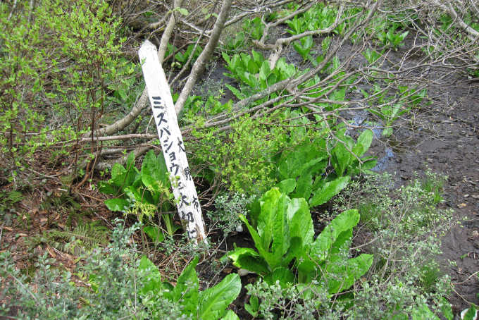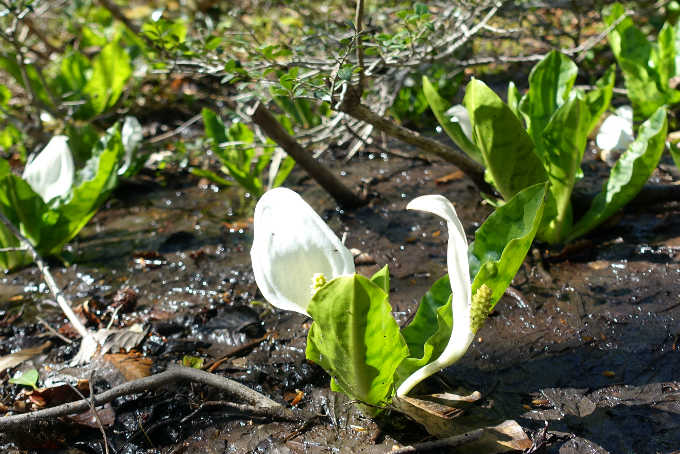 林の中を歩くと、小さな沢に出てさらに登り、広い稜線に取り付く。道は左に曲がり、少し下ると、登山道の脇がミズバショウの群生地になっている。灌木が生い茂った自然の中で花の見頃は終えていた。
