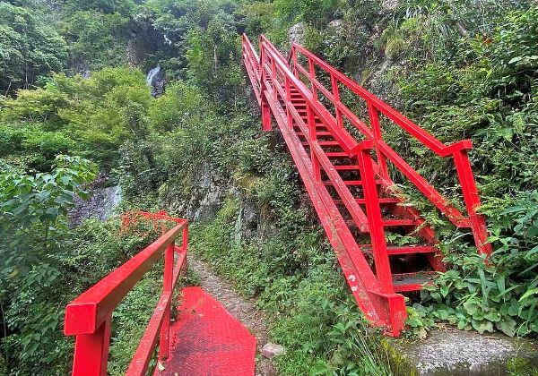 渓谷の赤い太鼓橋は森に包まれて一層映える