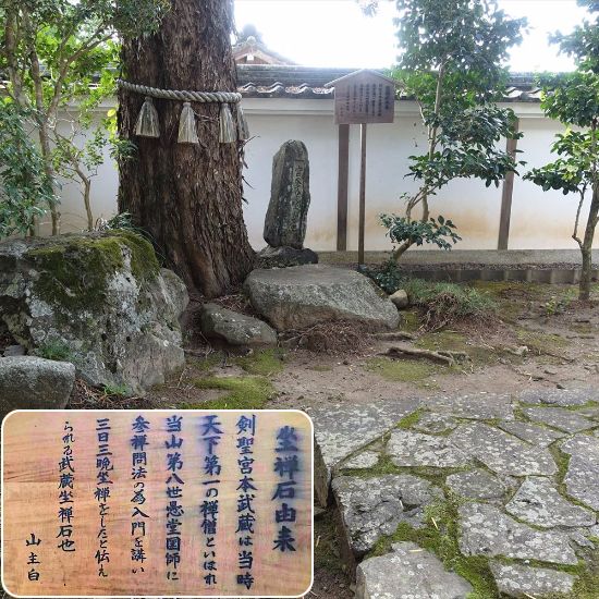 武蔵は、沢庵和尚が晩年を迎え美濃の大仙寺へ行くことを薦め、武蔵は大仙寺の愚堂国師について修行したと伝えられている。その時の武蔵が坐禅をしたといわれる石が残っている。