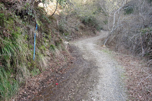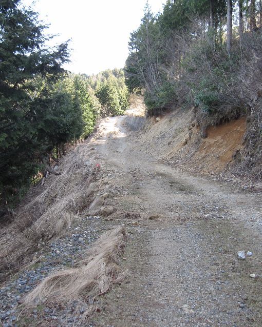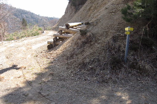 しばらくソボ洞を巻くように林道を行くとソボ洞登り口がある。ソボ洞は帰路で登るとして林道を先に進むと北からの林道出合となり右に折れる。山腹側は土砂崩れ止めの柵が施されている。