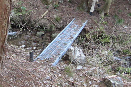 巡視路134標記の案内に沿って素振谷に下りるとアルミ製の橋があり、素振谷を渡る。山腹をトラバースして行くと二つ目のアルミ製の橋を渡りヒノキ林の山腹に移る。