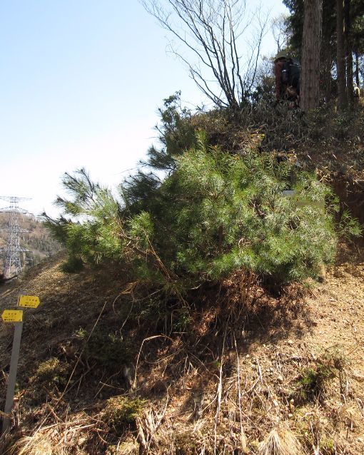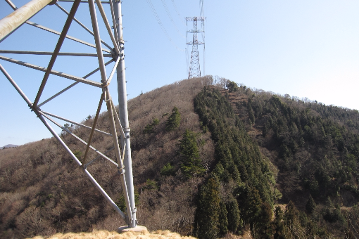 硬質ゴム階段の急傾斜な山道をジグザグに登る。途中に134号の鉄塔がある。所々に切り倒されたヒノキが道をふさいでいる。やがて見晴らしの良い134号鉄塔に出る。