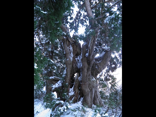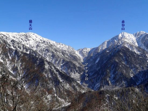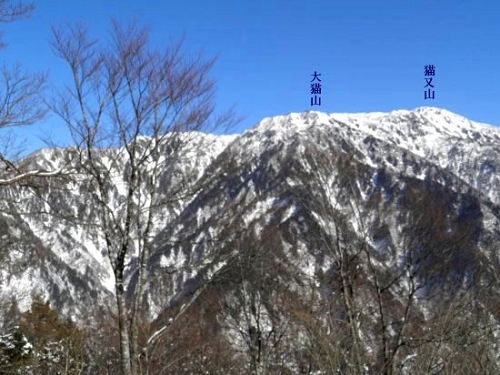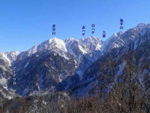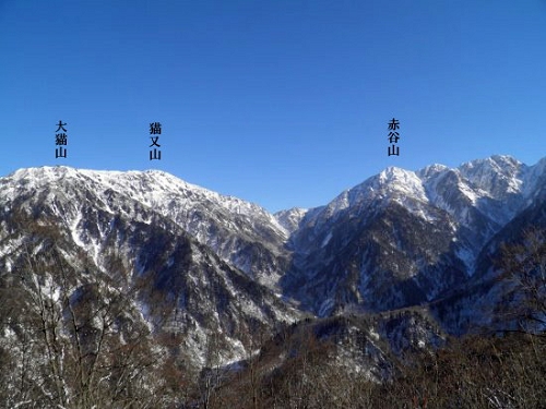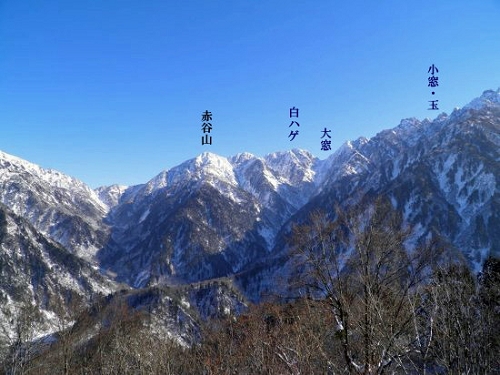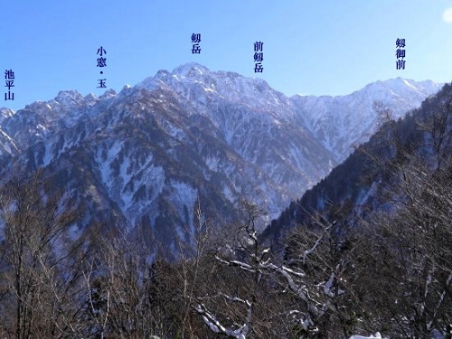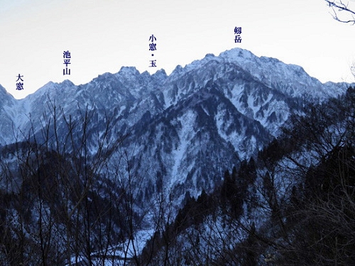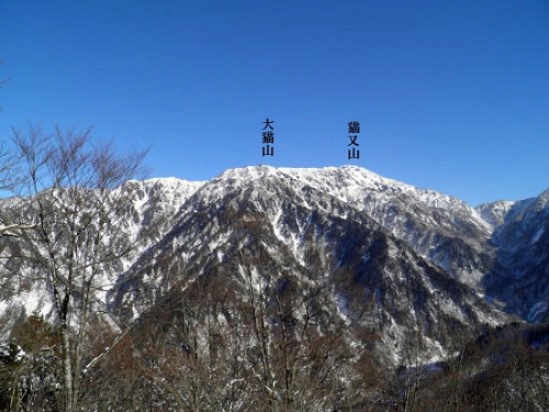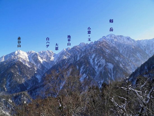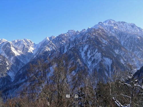 馬場島への林道は本来、11月から剣青少年研修センター先のゲートが冬季閉鎖中で登山口まで2~3キロ歩かなければならない。たまたま前の工事関係者の車が入ったので、続けて入ることができました。中山の登山口(馬場島)まで車で入り、本来周回コースを回る予定が、積雪が30~40センチありラッセルするのが大変で同じルートを往復した。登山道には巨大な立山杉がたくさんあり、圧倒されながら登る。P1170までは登り一辺倒でその後は山頂まで稜線歩きで山頂に着く。この時期にしては珍しく、真っ青な晴天で、すばらしい眺めであった。山頂から御前剱から剱岳・小窓・池平山・大窓・白ハゲ・と続く鋸状の岩稜が鋭く迫る。さらに赤谷山・猫又山・大猫山と続く峰々は大パノラマです。南には大日岳が望める。 (登り所要時間 2時間)