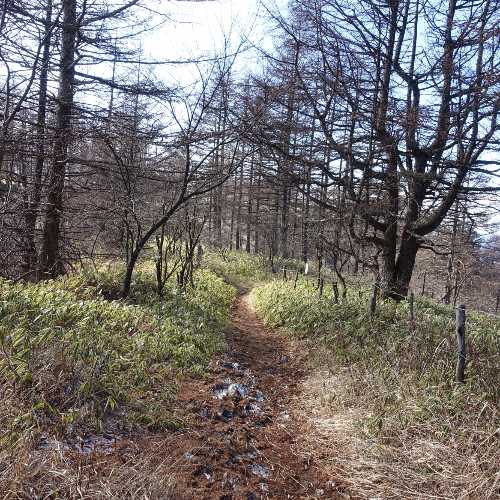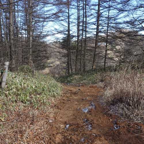 船津から林道西川新倉線に入り林道を標高1,380m地点まで来ると通行止めのッゲートがある。登山道は整備はされているが案内板はカチカチ山への案内表記はある。三ツ峠山登山道で霜山の南山腹を巻き緩やかな傾斜を登っていく。