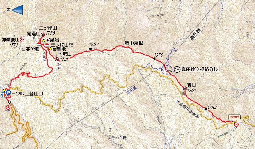 700m位進むと道が左右に分かれる高圧線巡視路と出会う。この分岐を尾根上に直進となる。倒木で道がふさがれているが巡視路に入らないように倒木を超えて直進する。緩やかな登りでP1378を過ぎて、さらに府戸尾根を進む。