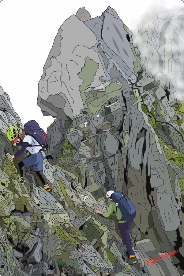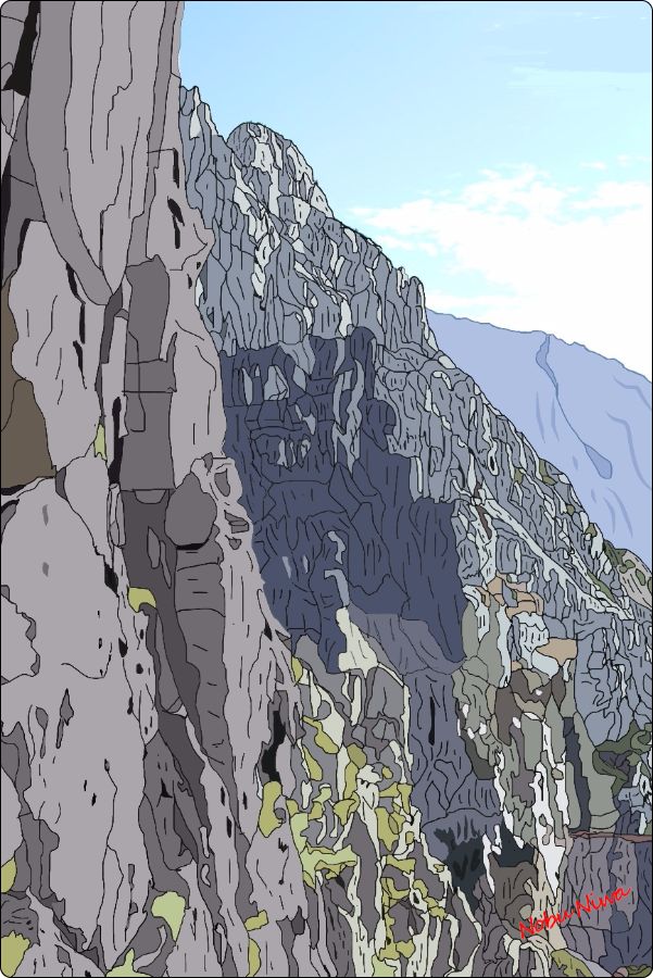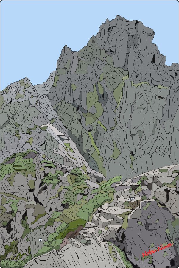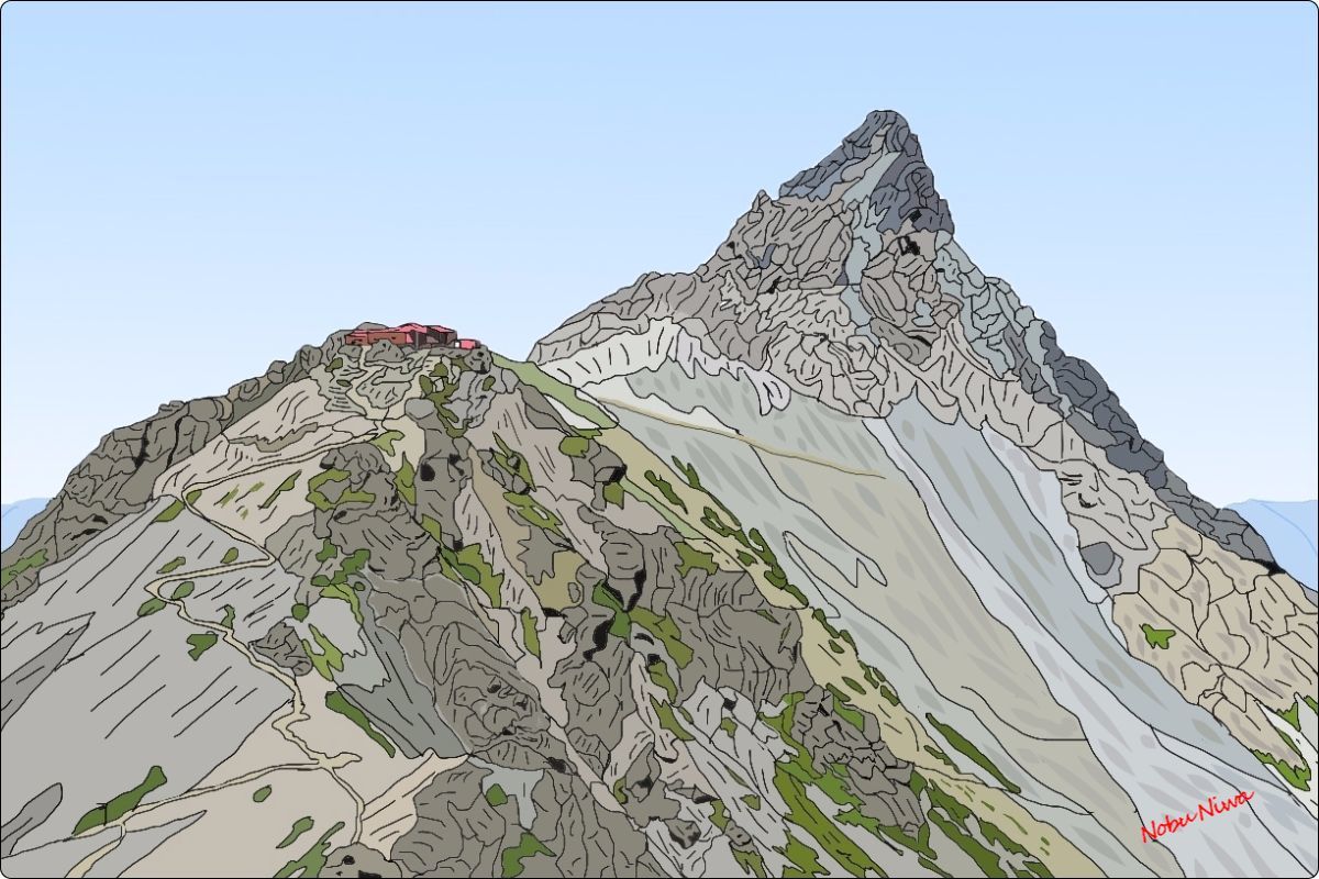 槍ヶ岳と穂高を結ぶ稜線上の大きく切れ下りた大キレット。場所によっては「窓」と呼ばれる地形で北ア屈指の難所。困難な縦走路で、そんな大キレットの魅力をスケッチしてみました。