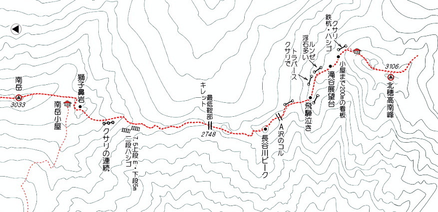大キレットの核心部の飛騨泣きと称する悪場がある。クサリに沿って信州側を登ったり稜線を岐阜県側に入ったりして岩稜を回り込み、 飛騨泣きに入る。