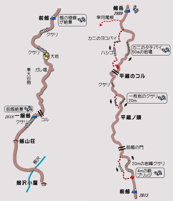 前剱から東大谷側へ稜を乗り越えて、足場の不安定な急な岩場を下る。次に現れる岩峰の手前で鉄ブリッジを渡り、この岩峰に取り付き、クサリに沿って右上していく。岩蜂の右肩からこれを巻く。